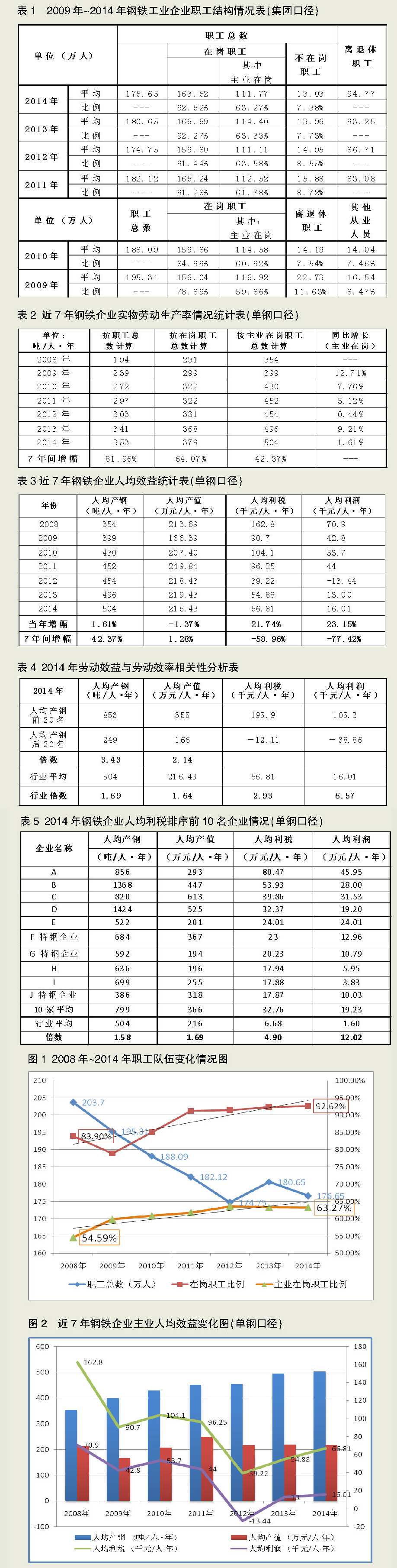 圖1顯示,2008年~2014年,納入統計范圍的鋼鐵企業粗鋼產量從3.9億噸提高到5.63億噸,增加了44%。與此同時,這些企業的職工總數從204萬人降低到177萬人,降低了13%。在崗職工比例逐年提高,7年提高了8.72個百分點,而不在崗職工比例逐年下降,主業在崗職工比例穩步提高,7年提高了8.68個百分點。在行業形勢日趨嚴峻的情況下,企業通過自然減員、主動優化等方式,“二線職工”“三線職工”等冗余人員的比例穩步下降。
